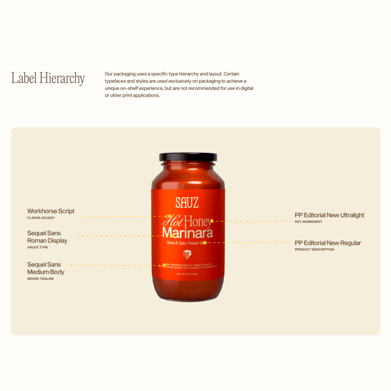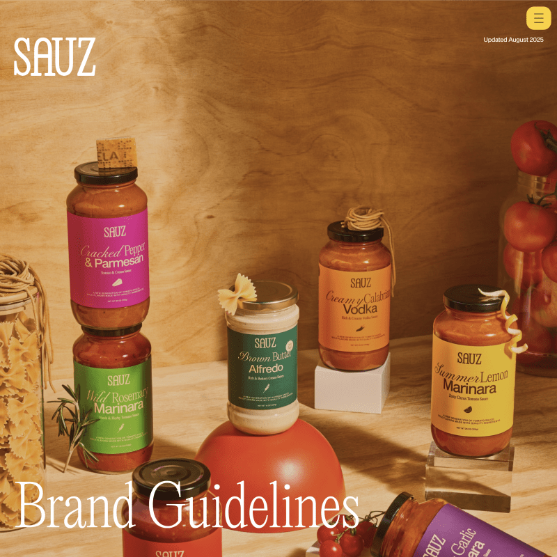 This resulted in a vibrant brand standards system that captures Sauz’s playful personality. It includes sharp guidance on brand strategy, photography style, type hierarchy, color pairings, and notably provides specific packaging design guidance—a nice touch to ensure every jar looks as good as it tastes.